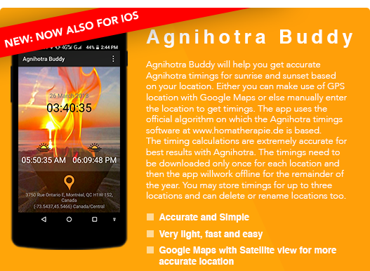 It is critical to understand the importance of timing the Agni Hotra performance exactly in line with when the sun’s first rays hit your place of residence and/or leave it, which is why there are all sorts of helpful tools available, e.g. this Google Maps based time calendar and the Agnihotra Buddy app, available on iOS as well as on Android: